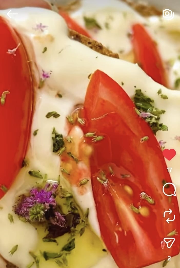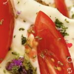 _Queso stracchino"Nonno Nanno", tomatitos de colina "La Torrente " cortados por la mitad, orégano y un hilo de aceite extra virgen de oliva.